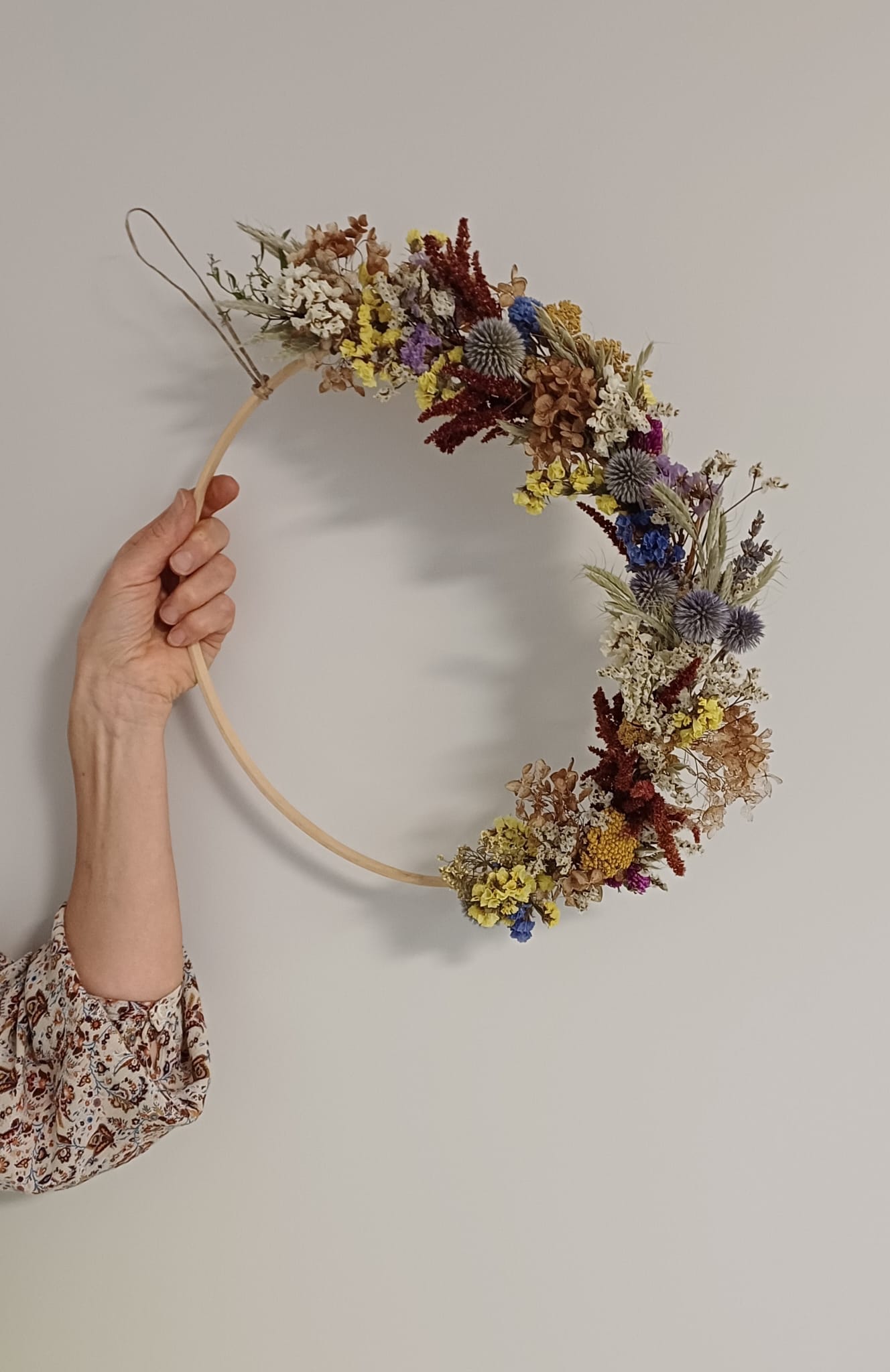 Laissez parler vos envies fleuries en créant une couronne unique à base de fleurs séchées locales.
